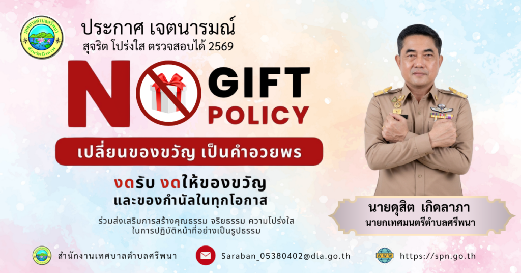 นโยบายไม่รับของขวัญ (No Gift Policy)ประกาศ ประกาศเทศบาลตำบลศรีพนา เรื่อง เจตนารมณ์ที่จะไม่รับของขวัญหรือของกำนัลทุกชนิดจากการปฏิบัติหน้าที่ (No Gift Policy) ประจำปี 2569 24 มีนาคม 2026 admin ประกาศเจตนารมณ์ ฉบับภาษาไทย เจตนารมณ์ ไทยดาวน์โหลด ประกาศเจตนารมณ์ ฉบับภาษาอังกฤษ เจตนารมณ์ Engดาวน์โหลด No Gift Policy นโยบายไม่รับของขวัญ เมื่อวันที่ 23 มีนาคม 2569 เวลา 10.00 น. ณ ห้องประชุมเทศบาลตำบลศรีพนา (ชั้น 3) สำนักงานเทศบาลตำบลศรีพนา อำเภอเซกา จังหวัดบึงกาฬ ได้จัดการประชุมสภาเทศบาลตำบลศรีพนา และได้ประกาศเจตนารมณ์ที่จะไม่รับของขวัญหรือของกำนัลทุกชนิดจากการปฏิบัติหน้าที่ (No Gift Policy) ของเทศบาลตำบลศรีพนา โดยมีวัตถุประสงค์ เพื่อปลูกฝังจิตสำนึกให้ข้าราชการและเจ้าหน้าที่ในการปฏิเสธการรับของขวัญและของกำนัลทุกชนิดจากการปฏิบัติงาน เพื่อให้ข้าราชการและเจ้าหน้าที่ได้เสริมสร้างวัฒนธรรมและค่านิยมสุจริต ในการปฏิบัติงานให้มีคุณธรรม จริยธรรม ความโปร่งใส และมีจิตบริการ ทั้งนี้ นายดุสิต เกิดลาภา นายกเทศมนตรีตำบลศรีพนา ได้ตระหนักถึงความสำคัญของปัญหาการทุจริต คอร์รัปชั่น จึงได้เน้นย้ำ คณะผู้บริหาร ข้าราชการและบุคลากรเทศบาลตำบลศรีพนา ทุกคนไม่รับของขวัญและของกำนัลทุกชนิดจากการปฏิบัติหน้าที่ ทั้งในขณะก่อนและหลังปฏิบัติหน้าที่ อันจะส่งผลให้เกิดการทุจริต และประพฤติมิชอบทั้งในปัจจุบันและอนาคต เพื่อสร้างวัฒนธรรมองค์กรและค่านิยมยุจริตในการปฏิบัติงานอย่าง มีคุณธรรม จริยธรรม และป้องกันการทุจริต